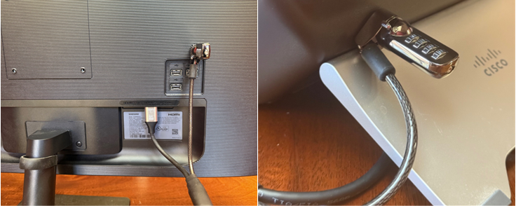 Unbeknownst to most users, almost all electronic devices include a security slot. The majority of these are directly compatible with our Security Cables product line. Before installation, verify that your device has a properly-sized security slot (Most devices use the industry-standard 3mm x 7mm size). The examples shown below--a commonly used monitor (shown with the Standard HDMI Security Cable ) and a desktop office phone (shown with the Standard Cat 8 Security Cable ) --both feature a security slot.