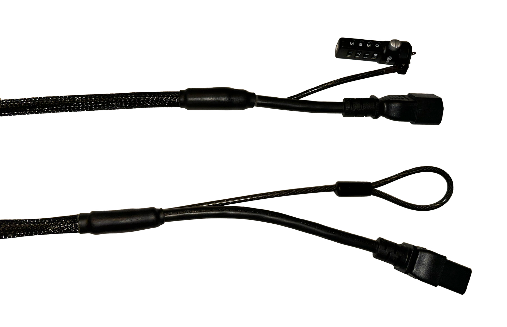 The Single Power Security Cable (C14 to C19 variant) plugs into any appropriate receptacle. The Single Power Security Cable (C14 to C19 variant) includes one lock on the Wall Plate Side of the cable (C14), and a cable loop one on the Equipment side of the cable (C19). Our patent-pending Security Cables are intended to be asymmetric, with a wall plate side (goes to our Security Cable Wall Plate) and an equipment side (goes to the device being secured). The primary difference is the length of the Cable Leader. The Single Power Security Cable has a standard wall plate Cable Leader length of 4" and the standard equipment side leader length 8" (with different leader lengths available via special order).